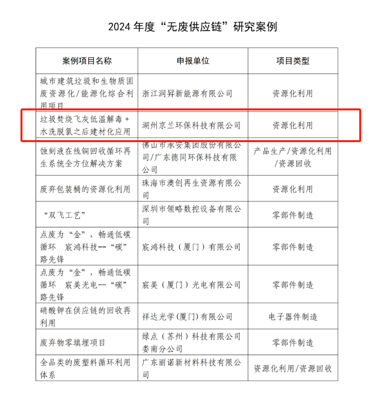 根據(jù)案例研究及匯報(bào)情況,本年度評(píng)選出10項(xiàng)“無(wú)廢供應(yīng)鏈”評(píng)價(jià)試點(diǎn)及10項(xiàng)“無(wú)廢供應(yīng)鏈”研究案例。湖州京蘭環(huán)保科技有限公司憑借 “垃圾焚燒飛灰低溫解毒 + 水洗脫氯之后建材化應(yīng)用” 項(xiàng)目脫穎而出,成功入選 “無(wú)廢供應(yīng)鏈” 研究案例。